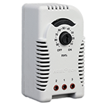 TTEC series mechanical thermostats for enclosure temperature control — NC (heater) and NO (fan) models.