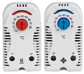 For anti-condensation: Hygrostat (60–65% RH) in series with NC thermostat set near your minimum temperature → heater runs only when both conditions are met.